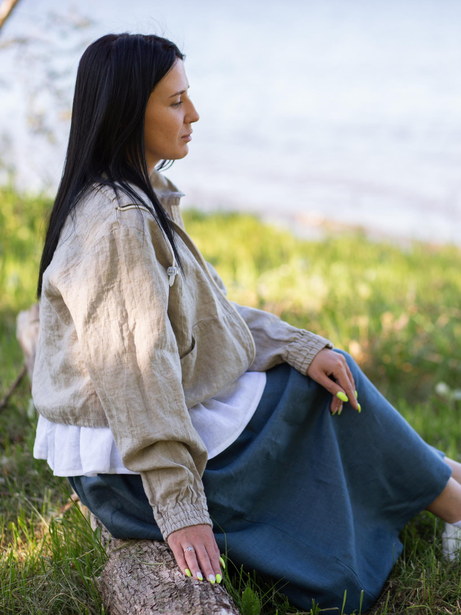 Куртка-ветровка на молнии, с накладными карманами изготовлена из 100% льна. Внизу затягивается на кулису. Интересное дополнение в Вашем гардеробе.Без подкладки.