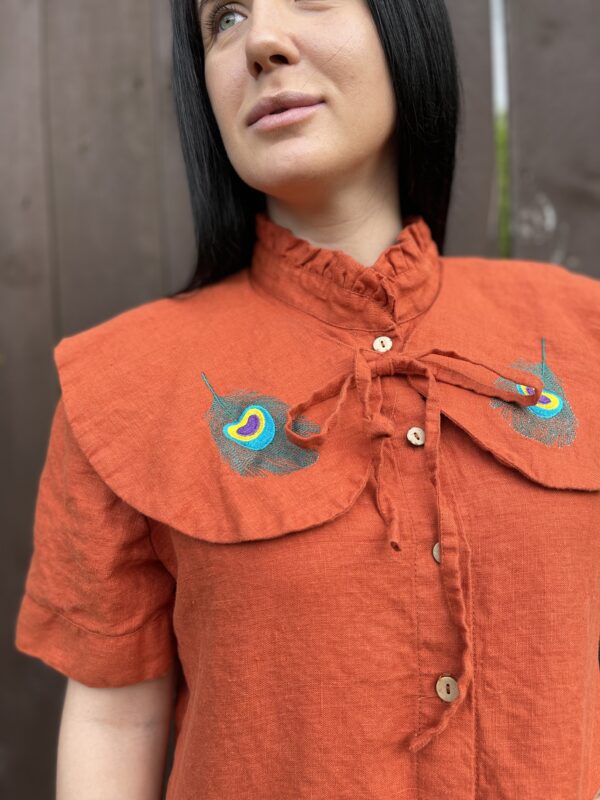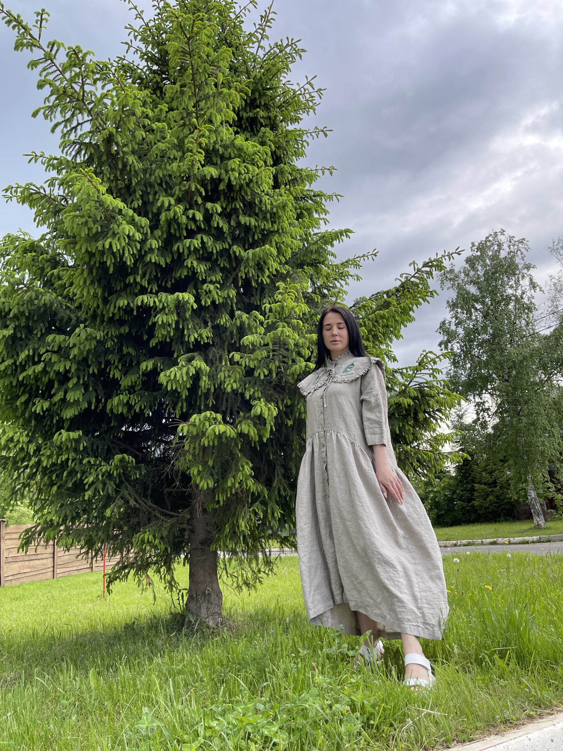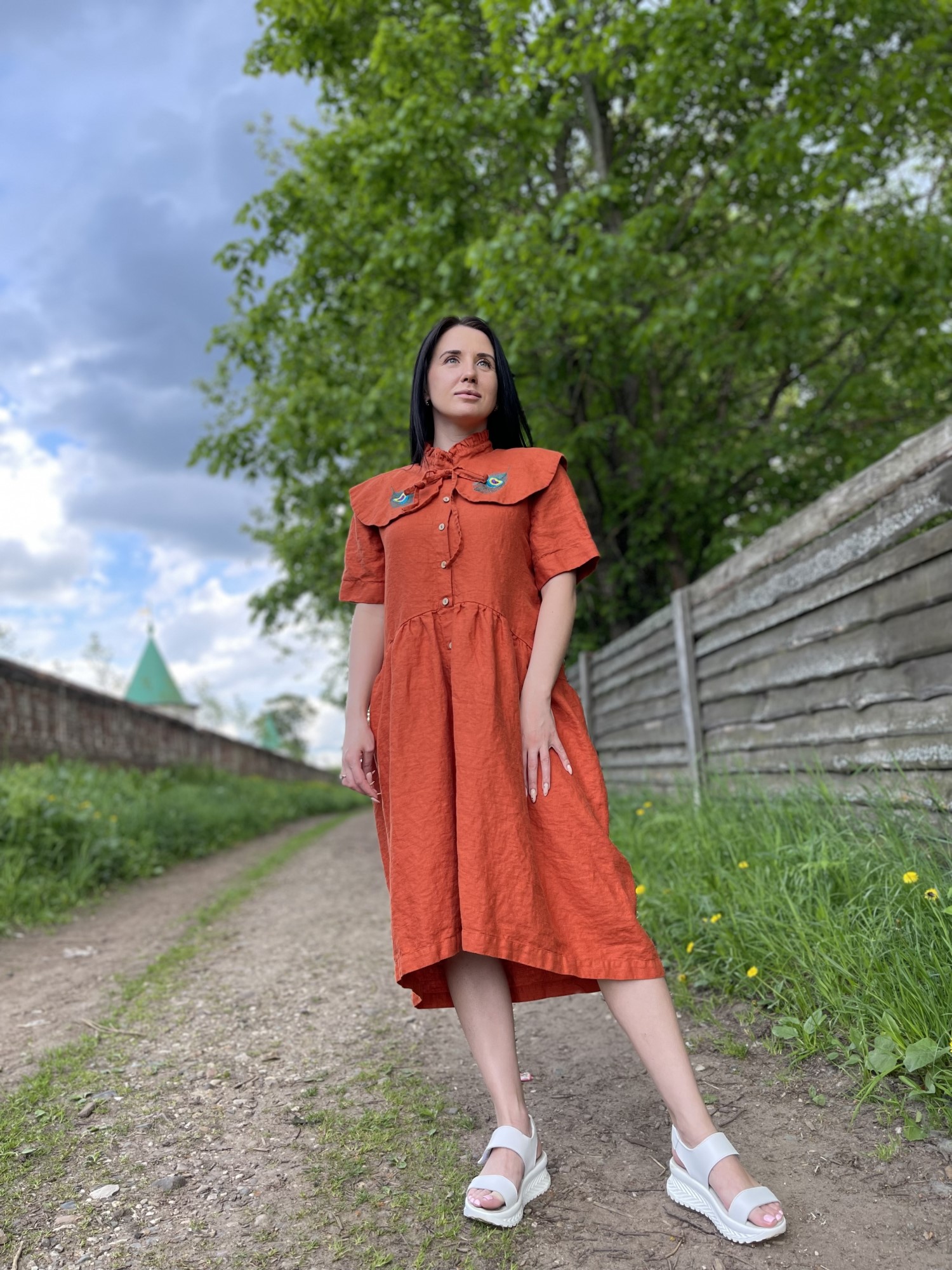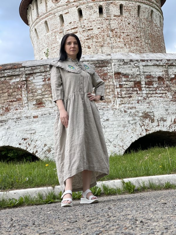 Льняное платье со съемным воротником, в стиле «Бохо» изготовлено из 100% умягченного льна. Застенка на петли и пуговицы. Карманы в боковых швах. Рукав ниже локтя. Низ ассиметричен, длиньше на 5-8 см в зависимости от роста.