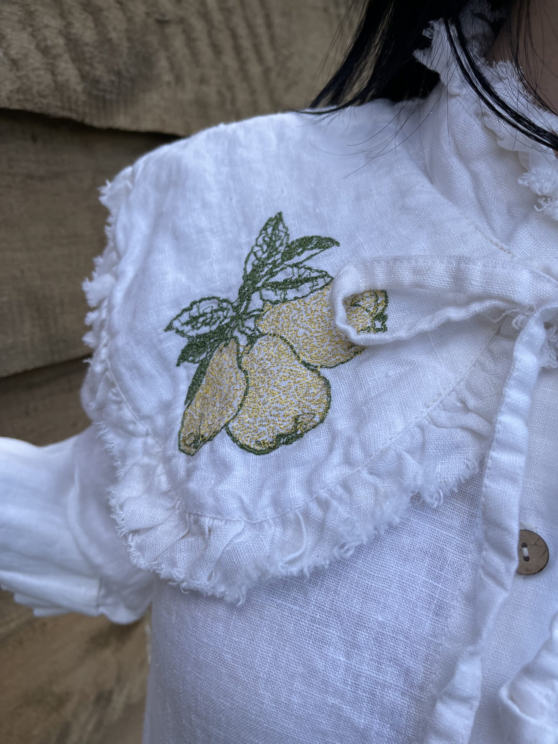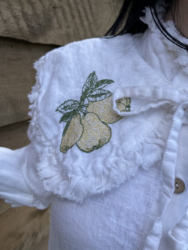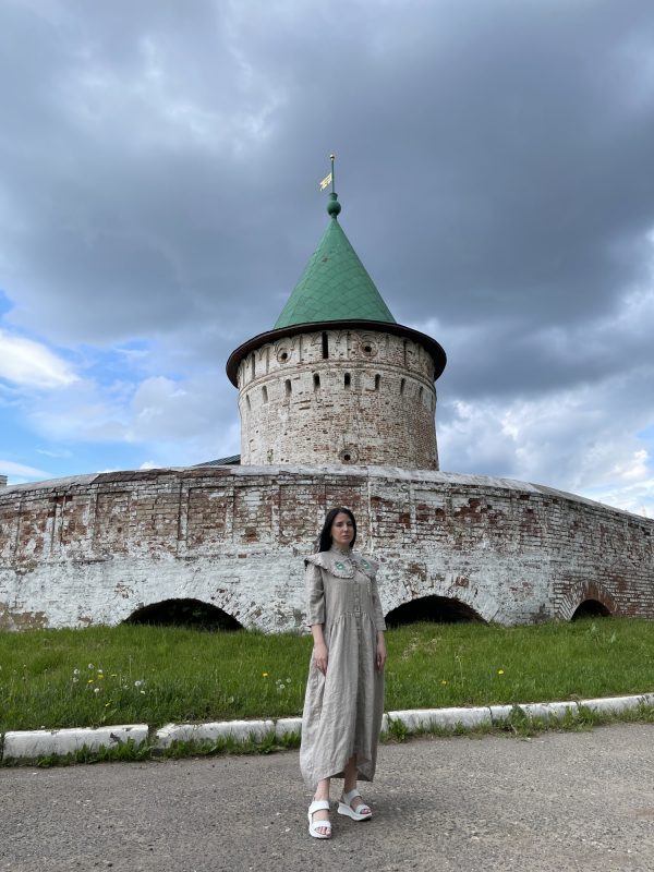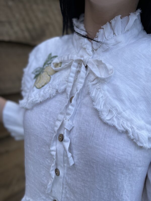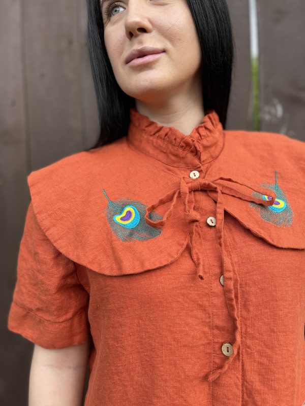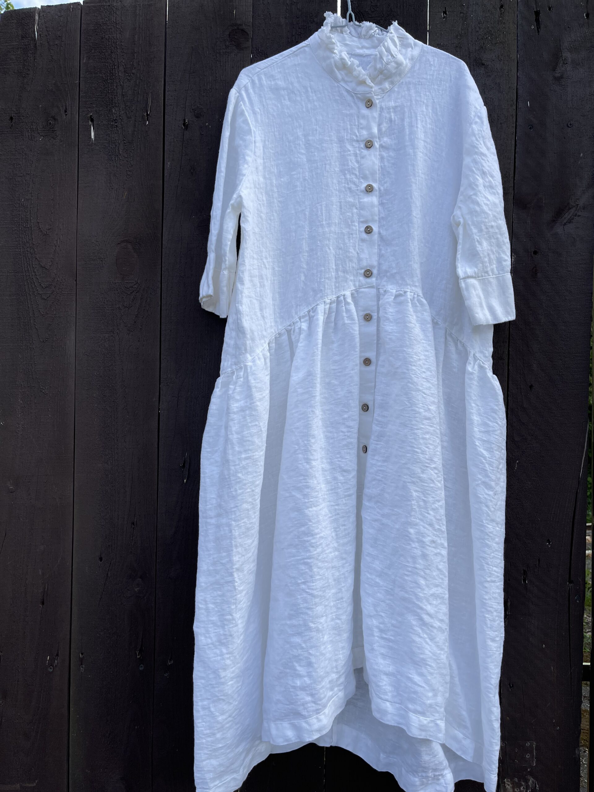 Льняное платье со съемным воротником, в стиле «Бохо» изготовлено из 100% умягченного льна. Застенка на петли и пуговицы. Карманы в боковых швах. Рукав ниже локтя. Низ ассиметричен, длиньше на 5-8 см в зависимости от роста.