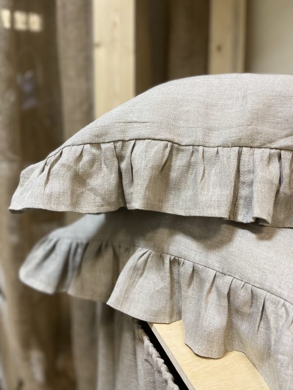 Льняная наволочка с рюшей по периметру, цвет серый. Размер 50*70 см. Клапан. Изготовлены из 100% умягченного льна.